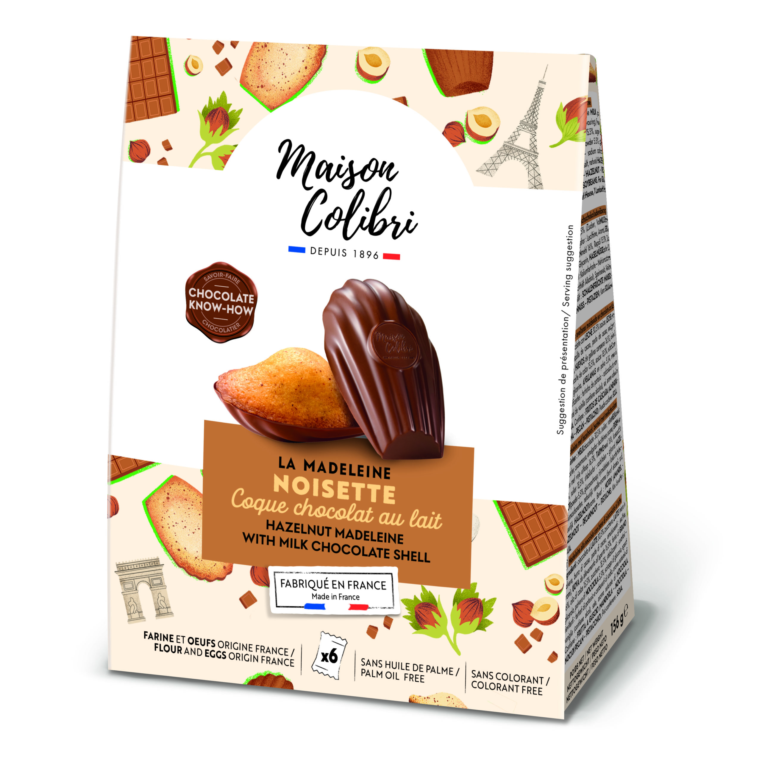 Hier wird die knusprige Vollmilchschokolade mit den zarten Madeleines und Haselnuss kombiniert. Ein einzigartiges und geschütztes Rezept seit 1973,  das Markenzeichen von Maison Colibri !