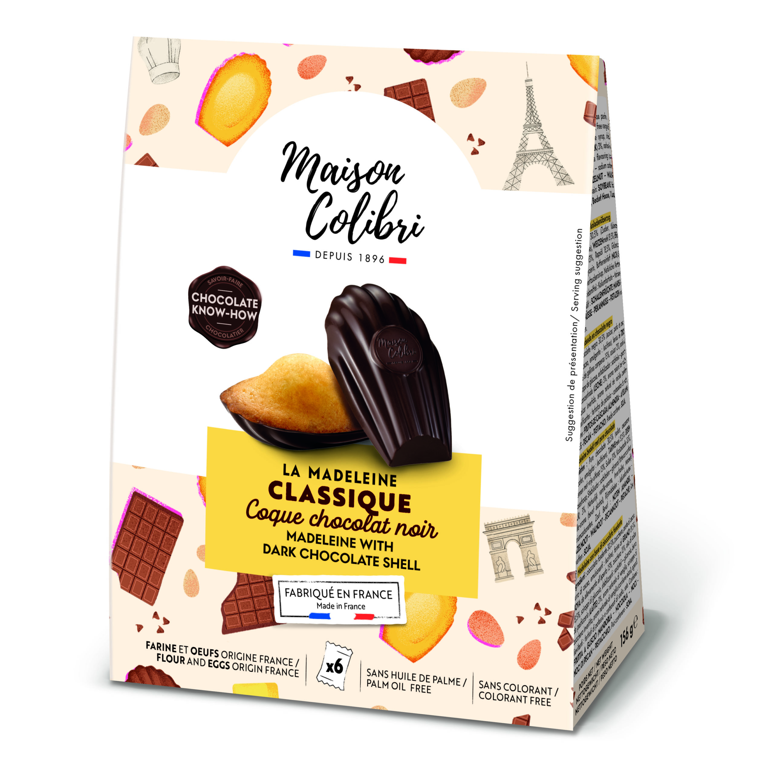 Hier wird die knusprige Bitterschokolade mit den zarten Madeleines kombiniert. Ein einzigartiges und geschütztes Rezept seit 1973,  das Markenzeichen von Maison Colibri !