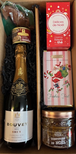 65,50 €Ein weihnachtlicher Geschenkkorb, gefüllt mit 6 exquisiten, süßen Delikatessen. Es ist die Zeit der Vorfreude, der süßen Naschereien und der Leckereien, die zum Teilen einladen.– Weihnachtsmarmelade: Marmelade mit den wunderbaren Clementinen aus Korsika und verfeinert mit Äpfeln und Gewürzkuchen– perfekt für Ihr Frühstücksbrot während den Weihnachtsfeiertagen.– Troll à croquer – eine süße, einzeln verpackte Schokofigur zum Naschen.– Schokolade Noel von Marie Bouvero:Diese Milchschokolade mit Weihnachtsmotiv ist nicht nur lecker, sondern auch ein echter Blickfang. Die Tafel ist mit Glitzer verziert und kann sogar auf der Rückseite individuell beschriftet werden, sodass eine Weihnachtskarte überflüssig wird.– „Cake aux fruits“: Ein köstlicher Kuchen mit leckeren kandierten Früchten – genau das hat unser Team für Sie zubereitet! Dank der perfekten Menge an kandierten Früchten entfaltet er seinen außergewöhnlichen Geschmack und verwöhnt Ihren Gaumen. Ob als kleiner Snack zwischendurch oder zum Nachmittagskaffee: Genießen Sie diesen wunderbaren Kuchen!– Der Rooibos „African Sweety“ mit Erdbeer ist eine verführerische Leckerei für Groß und Klein, die zu jeder Tageszeit genossen werden kann. Er schmeckt sowohl heiß als auch kalt gleichermaßen gut. Zudem wird ihm eine Reihe von gesundheitlichen Vorteilen zugeschrieben, darunter antioxidative Eigenschaften und die Unterstützung der Verdauung.– Die erfrischende Pastillen mit Orangengeschmack sind in einer wunderschönen, glänzenden Mini-Dose verpacktAlles in einem: ein perfektes Geschenk für die Weihnachtsfeiertage, das sowohl Groß als auch Klein begeistern wird.