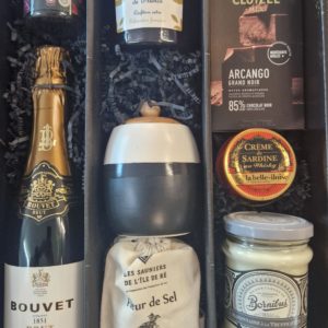 Abgerundet wird der Genuss durch einen eleganten Bouvet Sekt Brut, dessen spritzige Frische ideal ist, um gemeinsam anzustoßen und besondere Momente zu feiern. Stilvolle Details wie ein edler Keramiktopf für Fleur de Sel verleihen dem Geschenkset zudem einen Hauch von französischer Eleganz.