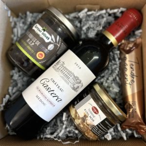 Ein sehr schönes Geschenk gefüllt mit traditionellen Delikatessen aus Frankreich: toller Rotwein zusammen mit verschiedenen Terrinen, Oliven und süßen Spezialitäten !