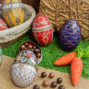 Die Eier sind wunderschöne Nachbildungen der „Fabergé-Eier“ von Carl Fabergé und somit echte Blickfänger. Sie sind gefüllt mit Schokoladenkugeln aus Milch- oder dunkler Karamellschokolade.