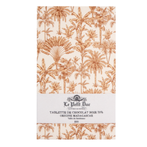 Hinter dieser wunderschönen Verpackung verbirgt sich eine hochwertige Herkunftsschokolade mit 70% Kakaoanteil und Aromanoten von Zitrusfrüchten, Mandeln und Karamell von Le Petit Duc aus Saint Remy de Provence
