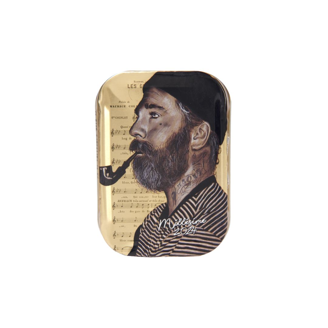 Diese Sonderedition der Jahrgangssardinen ist eine Hommage an die „Penn Sardin“ – die sardinenverarbeitenden Frauen der Bretagne. Die Illustration von Flore Betty zeigt eine stolze Bretonin vor dem Hintergrund eines historischen Liedes. Kulinarisch gereift und kulturell bedeutsam.