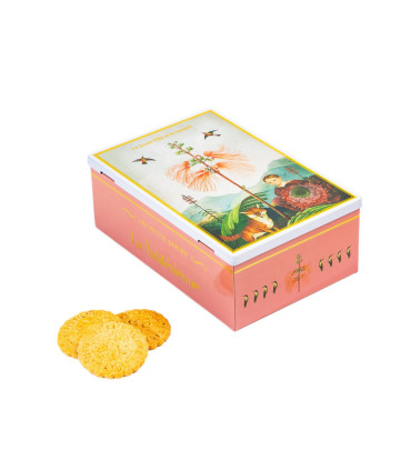 Diese kunstvoll illustrierte Metalldose enthält eine feine Auswahl französischer Sablés – verfeinert mit Himbeer- und salzigen Karamellstückchen. Zubereitet nach überlieferter Rezeptur, verbinden sie handwerkliche Qualität mit moderner Raffinesse. Eine stilvolle Geschenkidee – oder einfach ein Genussmoment für sich selbst