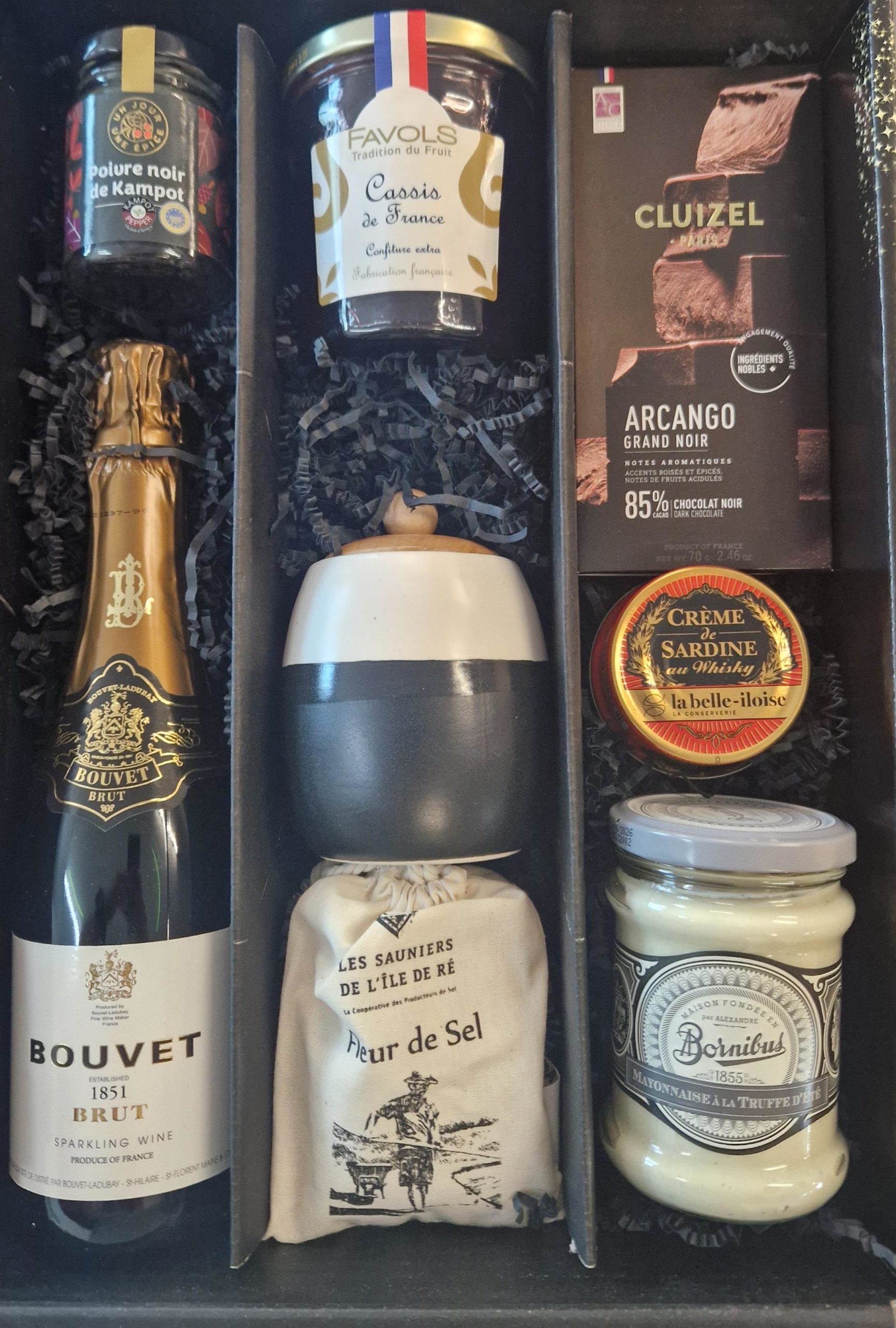 Abgerundet wird der Genuss durch einen eleganten Bouvet Sekt Brut, dessen spritzige Frische ideal ist, um gemeinsam anzustoßen und besondere Momente zu feiern. Stilvolle Details wie ein edler Keramiktopf für Fleur de Sel verleihen dem Geschenkset zudem einen Hauch von französischer Eleganz.