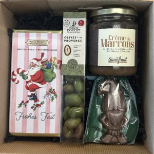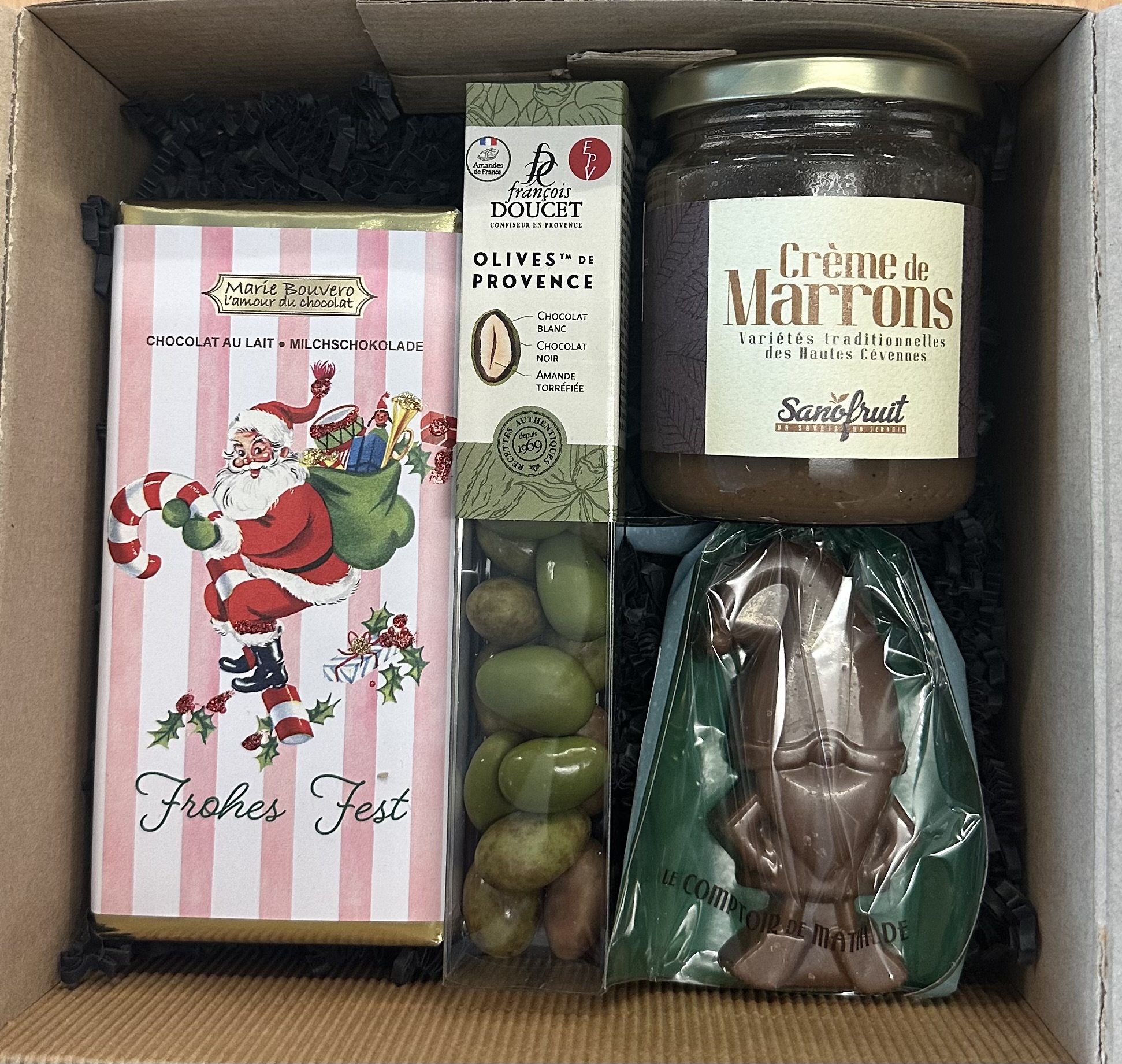 Ein kleiner aber feiner, weihnachtlicher Geschenkkorb, gefüllt mit einer erlesenen Auswahl an süßen Delikatessen.
