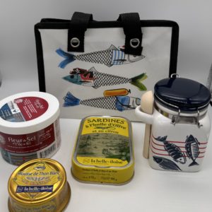 Kleines Täschchen mit Fischmotiven gefüllt mit verschiedenen Spezialitäten aus der Atlantikküste: ein schönes Geschenk für Fischliebhaber oder eine schöne Einstimmung bzw. Erinnerung an die französische atlantische Küste !